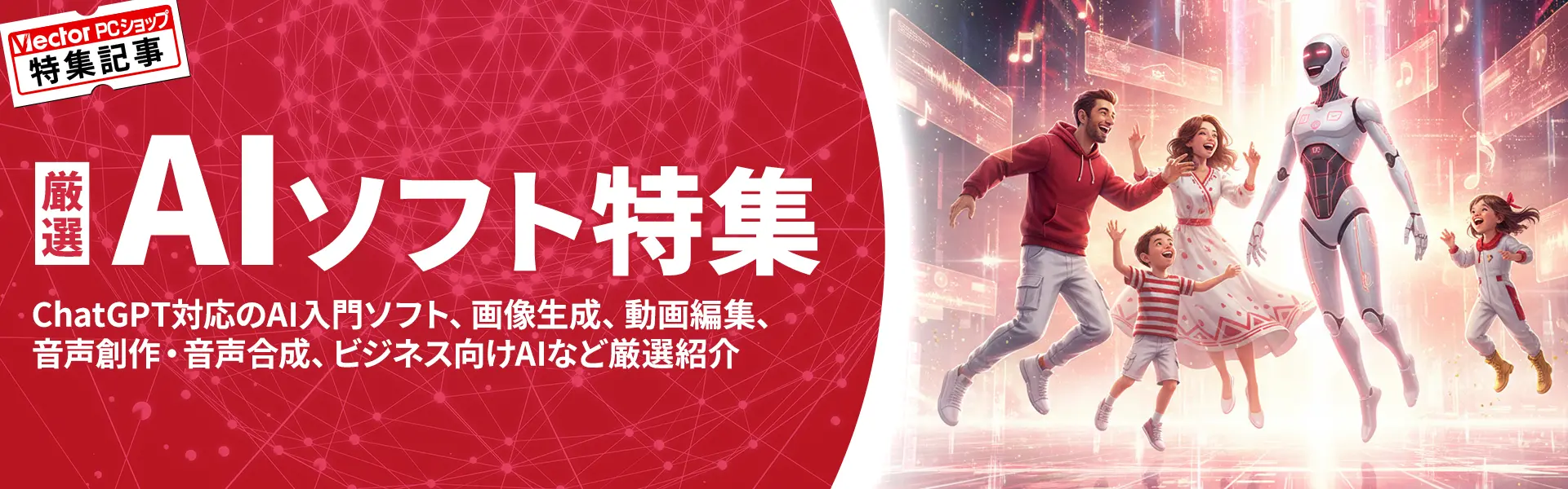 本特集では、こうした課題に応えるべく、長年にわたりダウンロードソフト販売を手がけてきたベクターPCショップならではの視点で、AI初心者からビジネスユーザー、クリエイターまで幅広く活用できるAI関連ソフトを厳選し、文章生成、画像・動画編集、音声合成、業務効率化、エンターテインメントまで、AIを「実際に使う」場面を想定し、生活や仕事をより便利に、より創造的にするソフトを分かりやすく紹介しています。