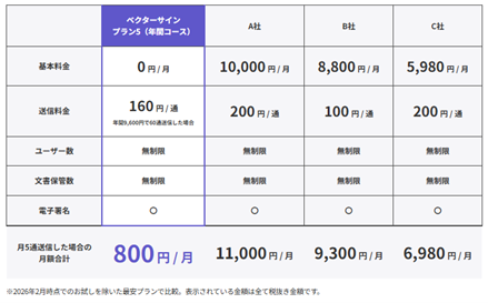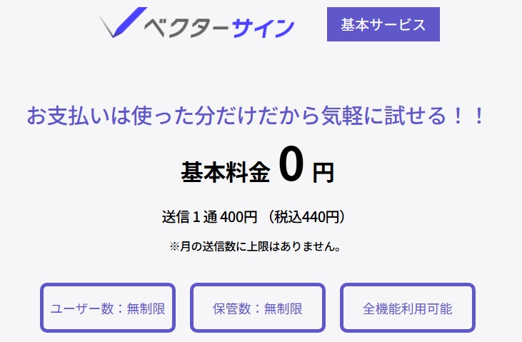 ベクターサインは、初期投資0円で、契約書などの文作成から締結、管理、保管までを一元化できる電子契約サービスです。